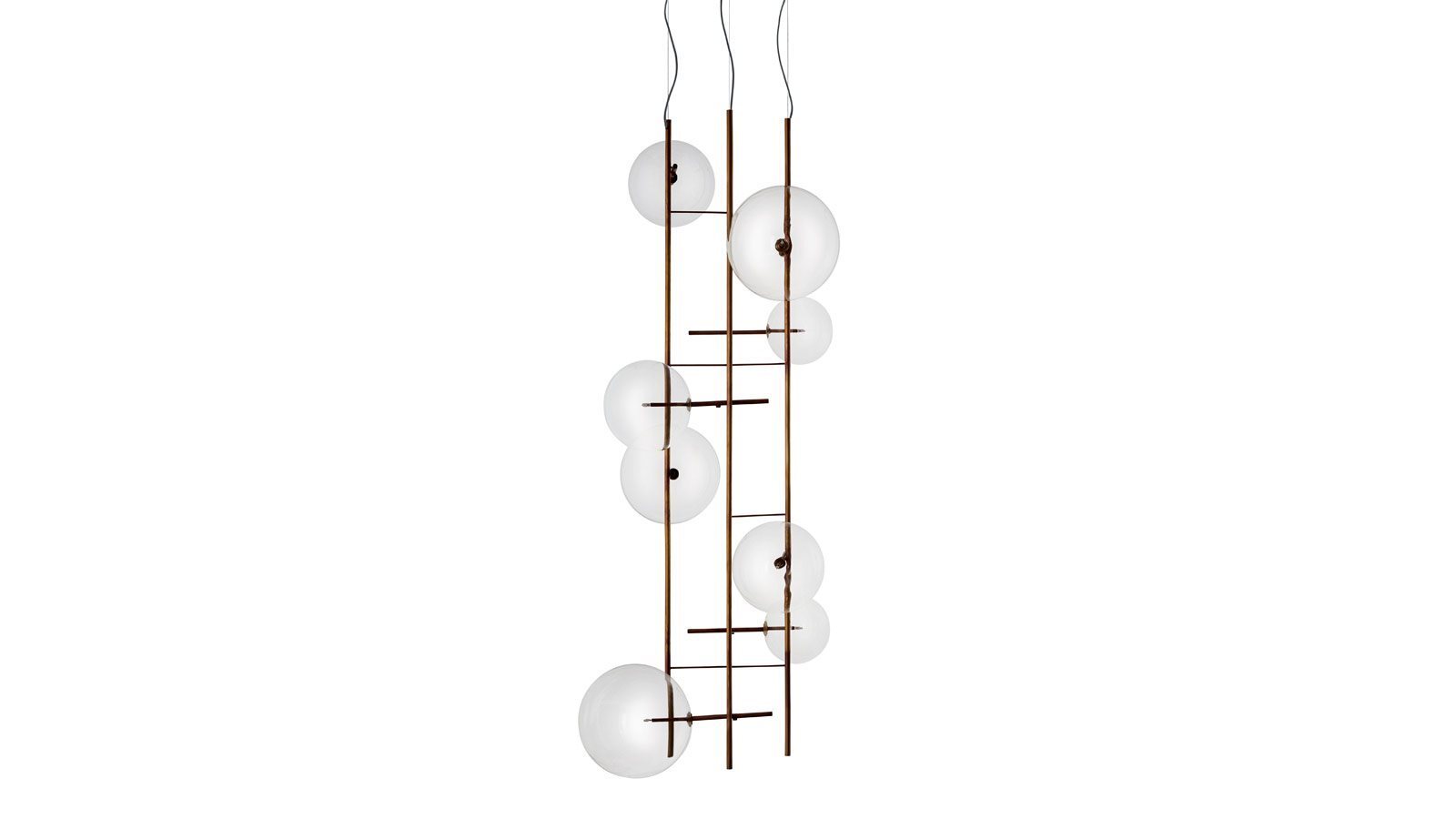 Hanging lamp with dimmable LED light with 6 or 8 transparent mouth-blown glass spheres. Metal parts in hand burnished brass. Supplied with cable 4mt long to customize height.